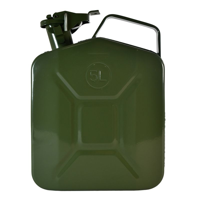 Bidón metálico 5 litros tipo militar: Robusto y compacto, perfecto para transportar y almacenar líquidos en aventuras al aire libre. Con asa y tapa segura.
