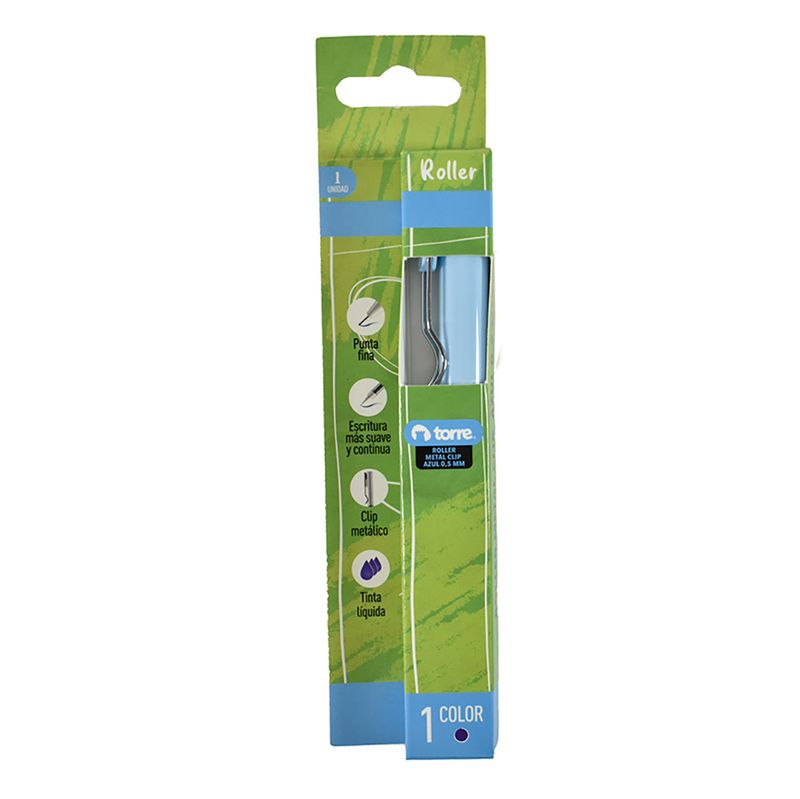 Bolígrafo roller Torre con clip de metal, color azul para el cuerpo. Elegante y duradero, ideal para una escritura suave y fluida. Perfecto para uso diario o profesional.