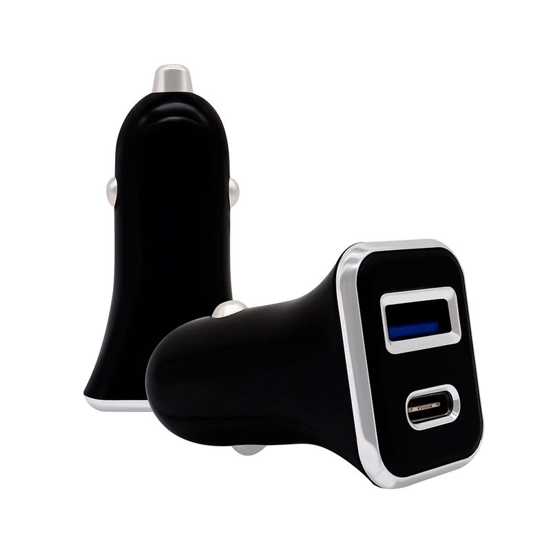 Funciona en auto y camión; Puerto USB y Tipo C; Entrada: 12V - 24V / Salida: 5V 2.4A; Material: ABS y aluminio