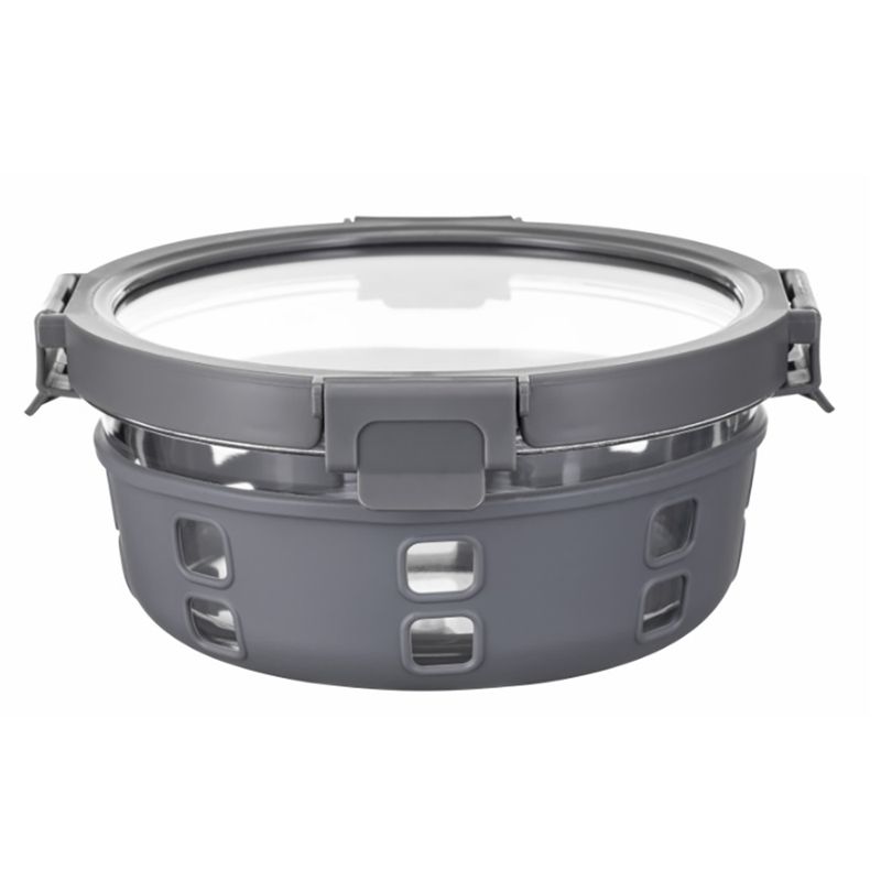 Contenedor vidrio redondo 950 ml con cubierta silicona gris y tapa hermética