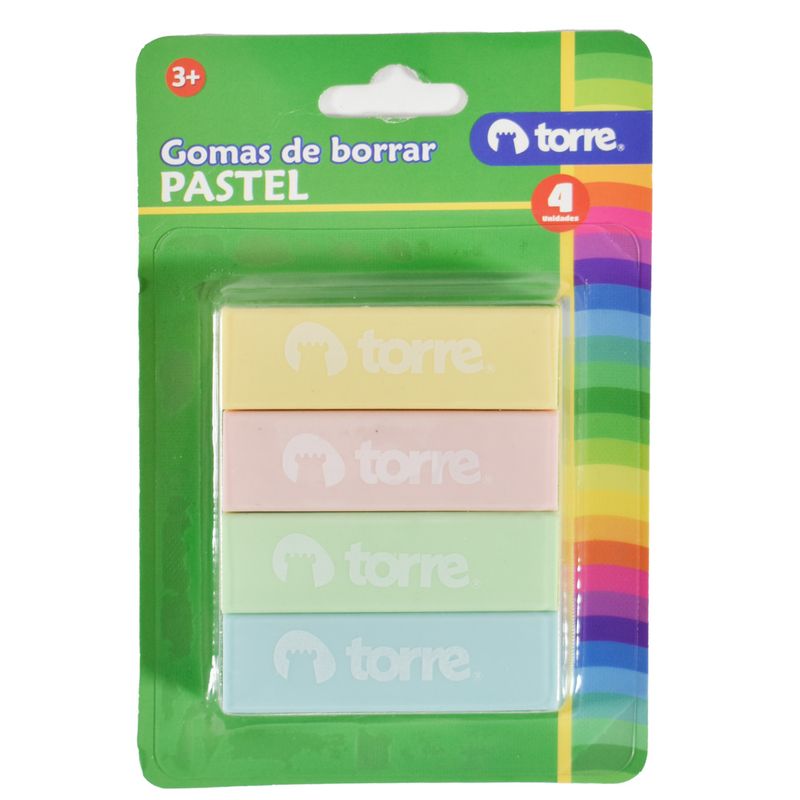 Goma de borrar Torre, set de 4 unidades en colores pastel. Calidad confiable para eliminar trazos de lápiz con precisión. Perfectas para uso escolar, profesional o personal.