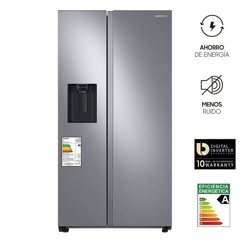 La Heladera Side by Side Samsung es un electrodoméstico de alta tecnología con un diseño elegante en color gris. Cuenta con un compresor de línea inverter que optimiza la eficiencia energética, lo que se traduce en un menor consumo de energía y, por lo tanto, una factura de luz más baja.