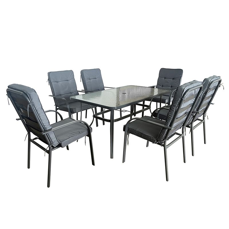 Juego de jardín con mesa de vidrio y 6 sillas. Elegante y moderno, ideal para exteriores. Mesa resistente con superficie de vidrio templado. Sillas cómodas y duraderas. Perfecto para reuniones al aire libre.