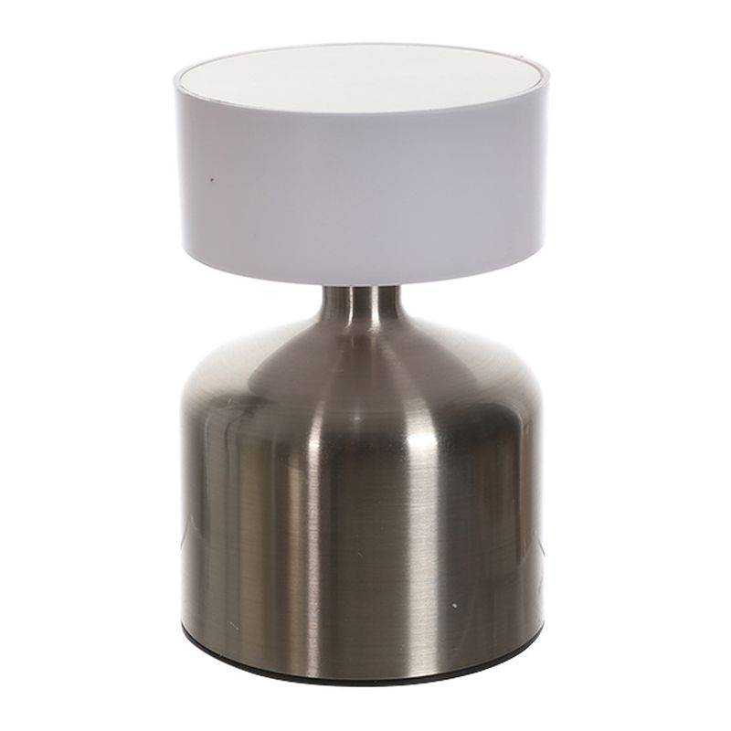 Lámpara LED de 9x14 cm en color plateado. Compacta y elegante, perfecta para iluminar espacios pequeños con un toque moderno. Ideal para escritorios, mesitas de noche o estanterías con estilo contemporáneo.