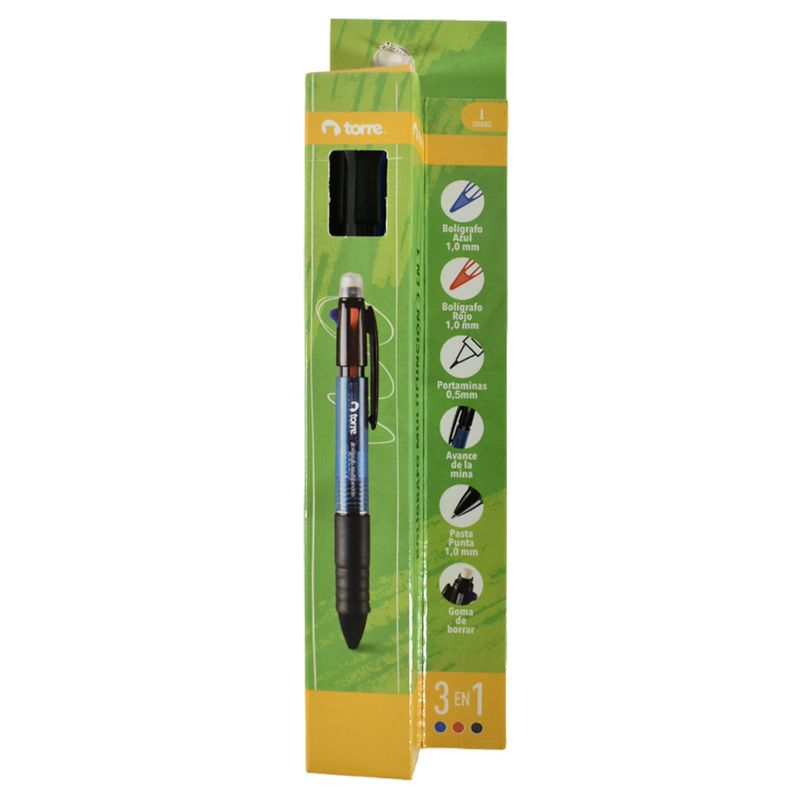 Lápiz multifunción Torre con 2 bolígrafos en azul y rojo, además de un portaminas. Práctico y versátil para escribir y dibujar con diferentes colores y tipos de puntas. Ideal para tomar notas y hacer esbozos.