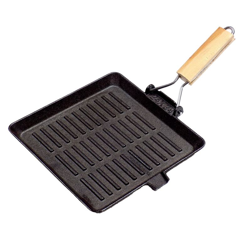 Plancha grill cuadrada con mango en madera 24x24cm hierro
