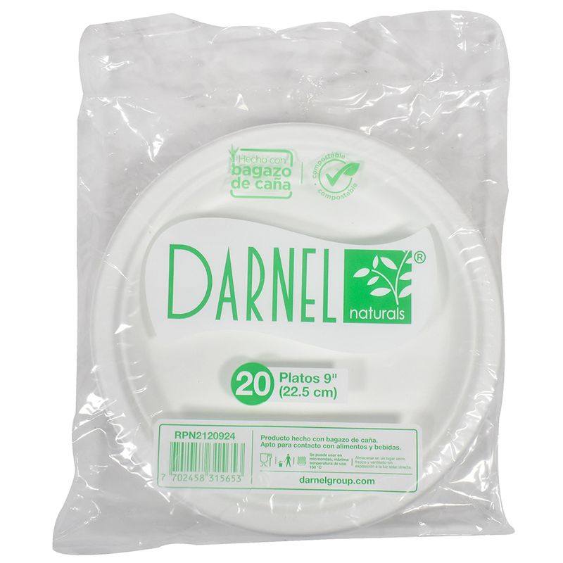 Plato ecológico de bagazo de caña en blanco, diámetro de 23 cm. Sostenible y versátil, ideal para eventos y ocasiones especiales. Paquete de 20 unidades.