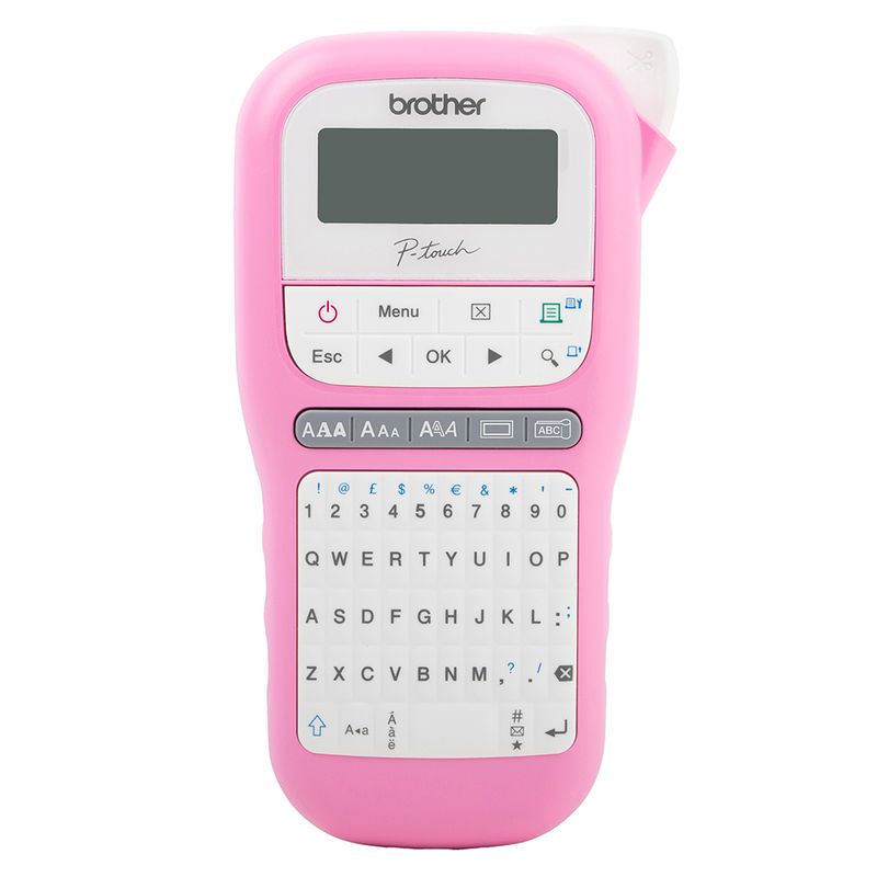 La rotuladora Brother PT-H110PK rosa cuenta con teclado QWERTY y pantalla gráfica para una fácil visualización antes de imprimir. Ofrece 3 fuentes, 10 estilos, 14 marcos y más de 250 símbolos. Ideal para organizar cables con su función especial, almacena hasta 15 etiquetas y usa cintas TZe en varios tipos.