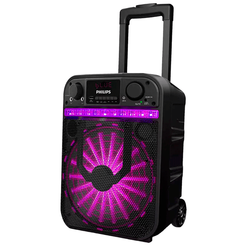 Llevá la fiesta a cualquier lugar con el parlante Bluetooth sobre ruedas. Obtendrás dos entradas de micrófono para que puedas hacer lo que quieras en vivo. Los efectos de luces para fiestas y las funciones de karaoke aportan a la atmósfera. Siete horas de tiempo de reproducción para que disfrutés por más tiempo.