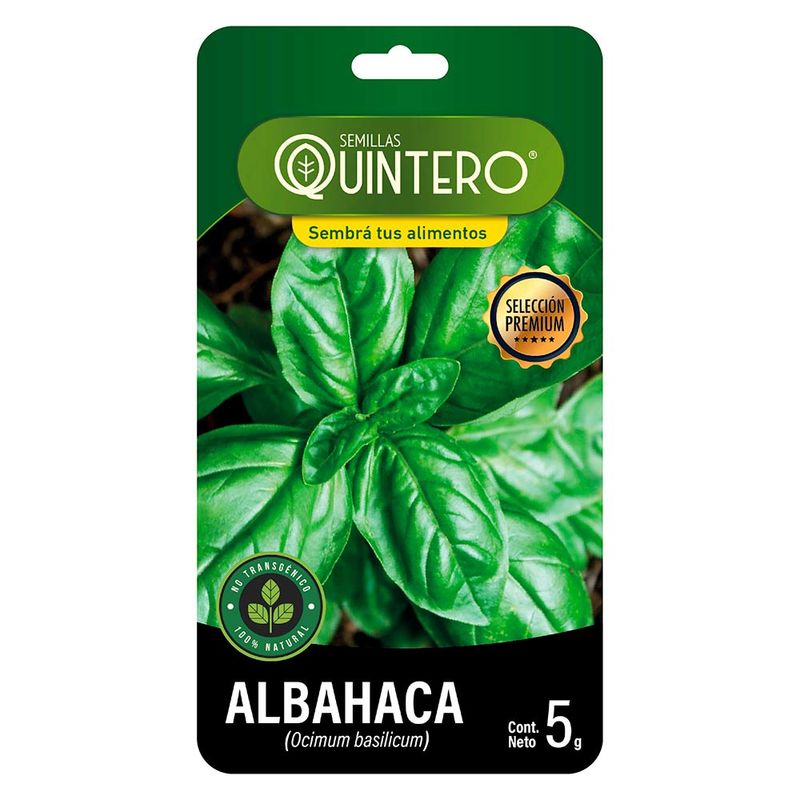 Sobre de Semilla de Albahaca QUINTERO 5 g: Cultiva albahaca aromática en casa con estas semillas de calidad. Aroma y sabor auténticos para tus platos. Convierte tu espacio en un jardín de hierbas y disfruta de cosechas frescas para realzar tus comidas con el toque distintivo de la albahaca.