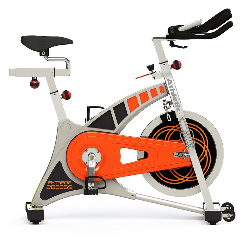 Entrénate con los mejores aparatos de ejercicio. Este spinning Athletic Extreme 2600BS, cuenta con disco Inercia 20 Kg, funciones scan, velocidad, distancia, tiempo, calorías, pulsaciones, Hand grip, dimenciones 1130x510x1010 mm, freno de seguridad, transmisión correa, peso usuario 135kg. Excelente calidad.